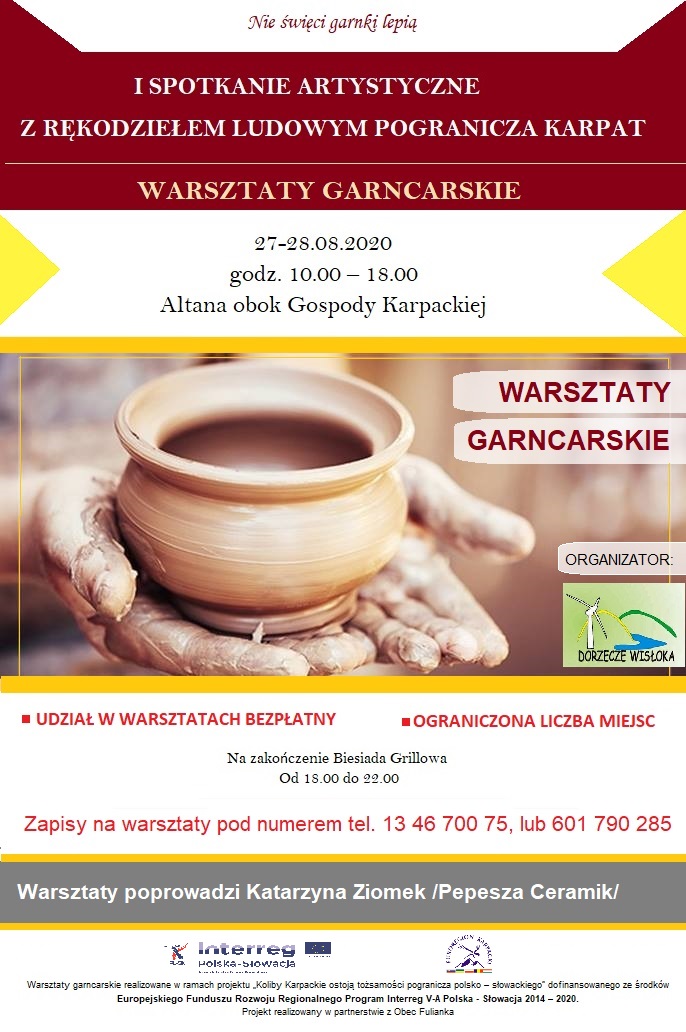 Warsztaty garncarskie realizowane są w ramach projektu „Koliby Karpackie ostoją tożsamości pogranicza polsko – słowackiego” dofinansowanego ze środków Europejskiego Funduszu Rozwoju Regionalnego Program Interreg V-A Polska - Słowacja 2014 – 2020.