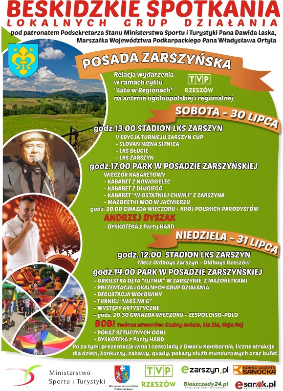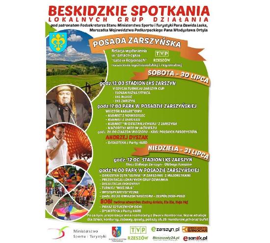 W dniach 30-31 lipca 2016r. w Posadzie Zarszyńskiej odbędzie się impreza pn. Beskidzkie Spotkania Lokalnych Grup Działania. Organizatorzy przewidują wiele atrakcji dla dorosłych i dzieci. Patronat honorowy nad imprezą objął Podsekretarz Stanu Ministerstwa Sportu i Turystyki Pan Dawid Lasek i Marszałek Województwa Podkarpackiego Pan Władysław Ortyl. Więcej szczegółów na plakacie. Zapraszamy serdecznie.