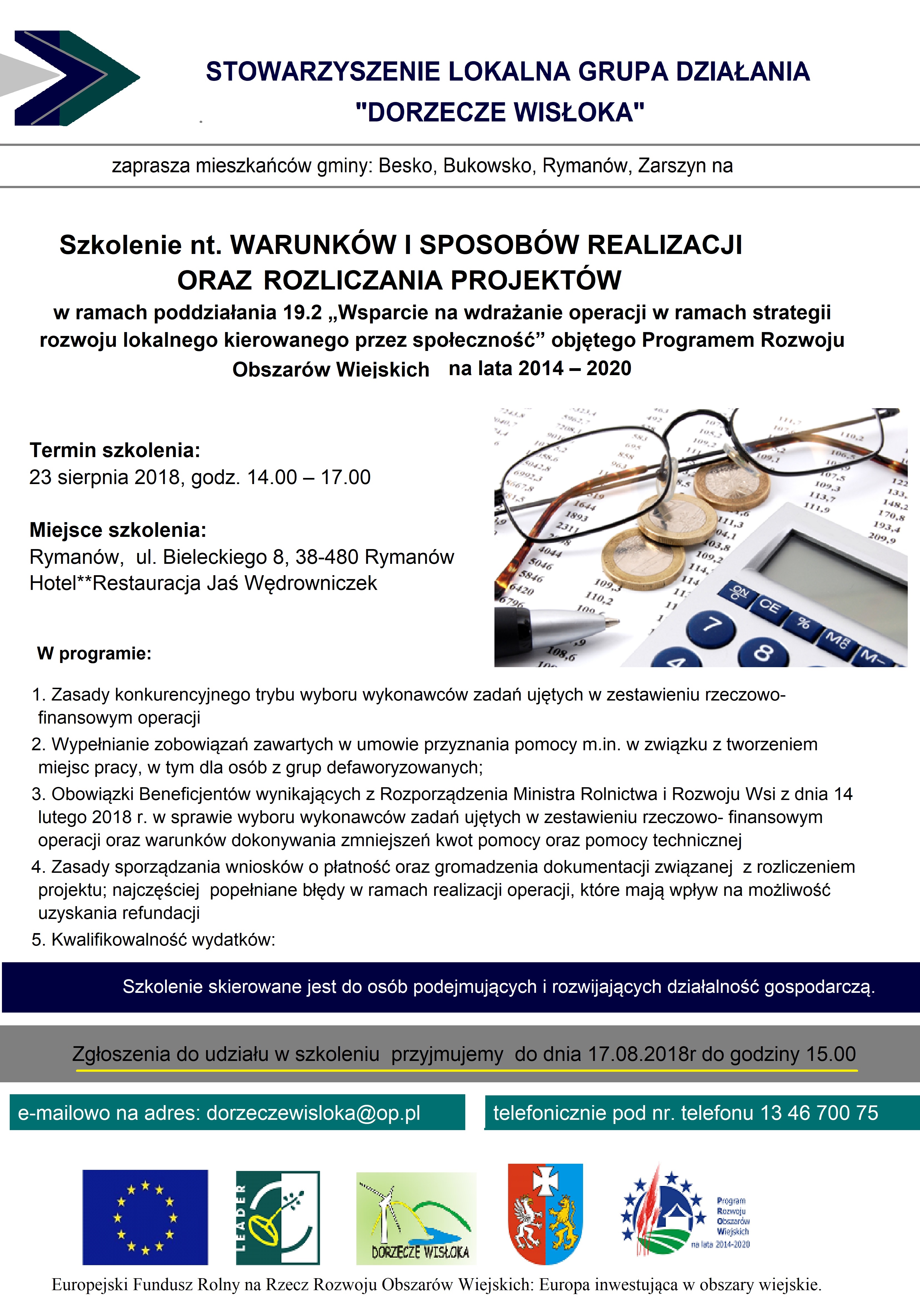 Stowarzyszenie Lokalna Grupa Działania "Dorzecze Wisłoka" zaprasza osoby podejmujące i rozwijające działalność gospodarczą na szkolenie nt. WARUNKÓW I SPOSOBÓW REALIZACJI ORAZ ROZLICZANIA PROJEKTÓW, które odbędzie się w dniu 23.08.2018 r. w godzinach 14.00 – 17.00 w Rymanowie - Hotel**Restauracja Jaś Wędrowniczek.
