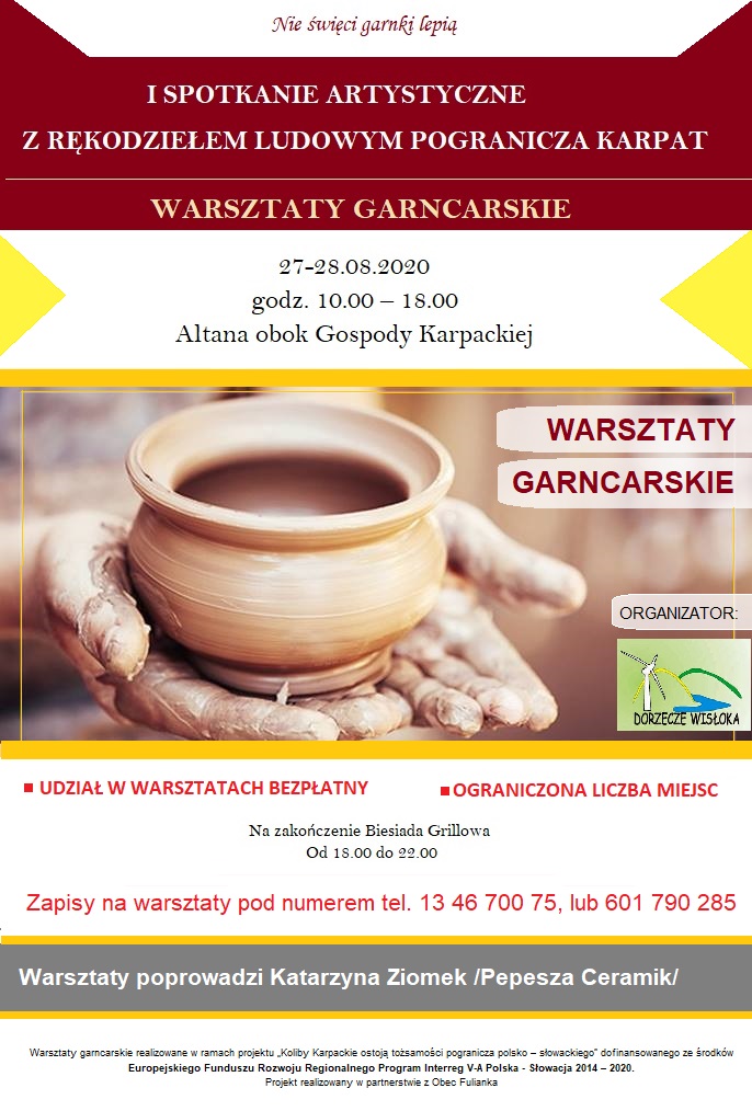 Warsztaty garncarskie realizowane są w ramach projektu „Koliby Karpackie ostoją tożsamości pogranicza polsko – słowackiego” dofinansowanego ze środków Europejskiego Funduszu Rozwoju Regionalnego Program Interreg V-A Polska - Słowacja 2014 – 2020.