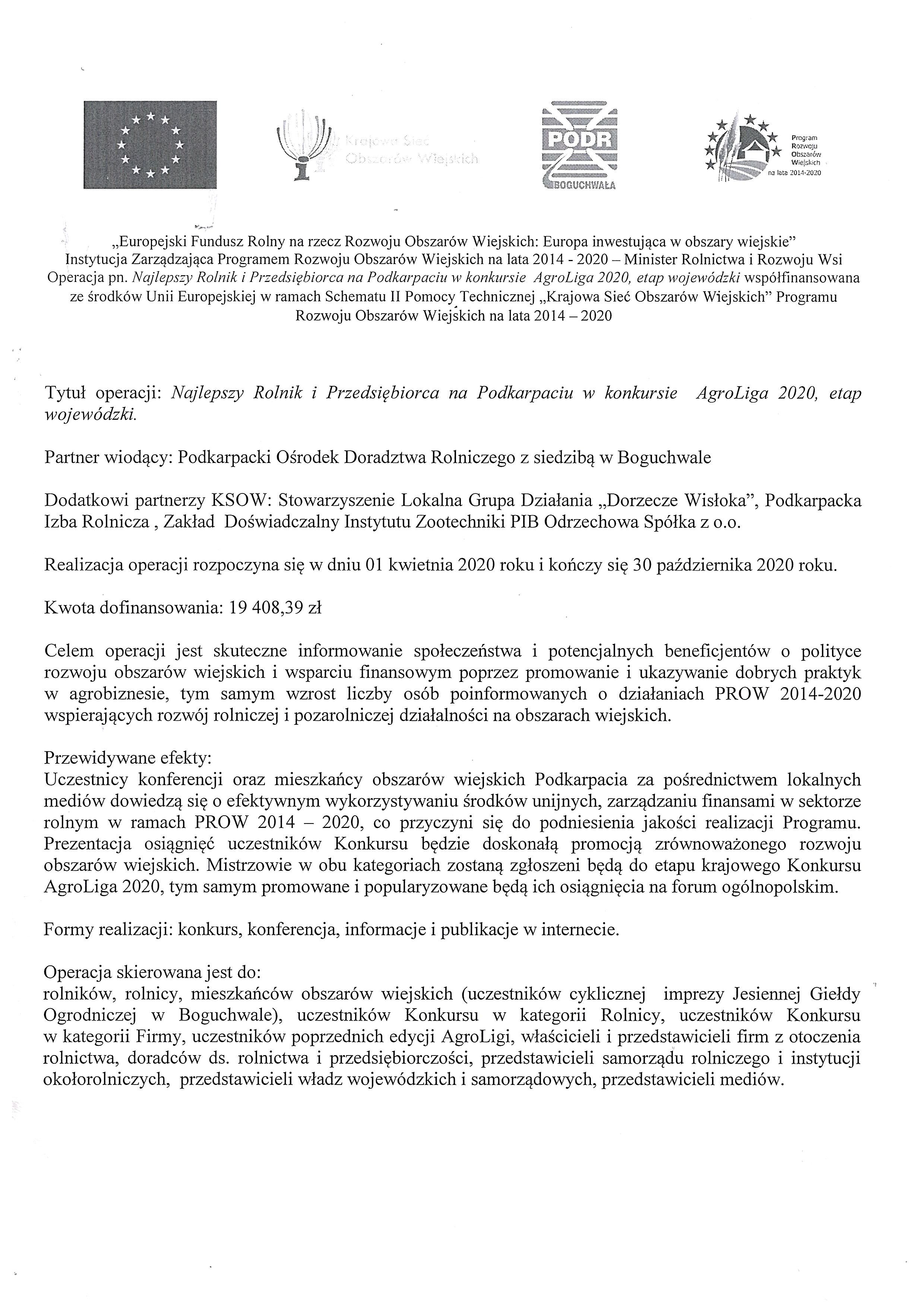 Najlepszy Rolnik i Przedsiębiorca na Podkarpaciu w konkursie AgroLiga 2020, etap wojewódzki, jako dodatkowy partner KSOW